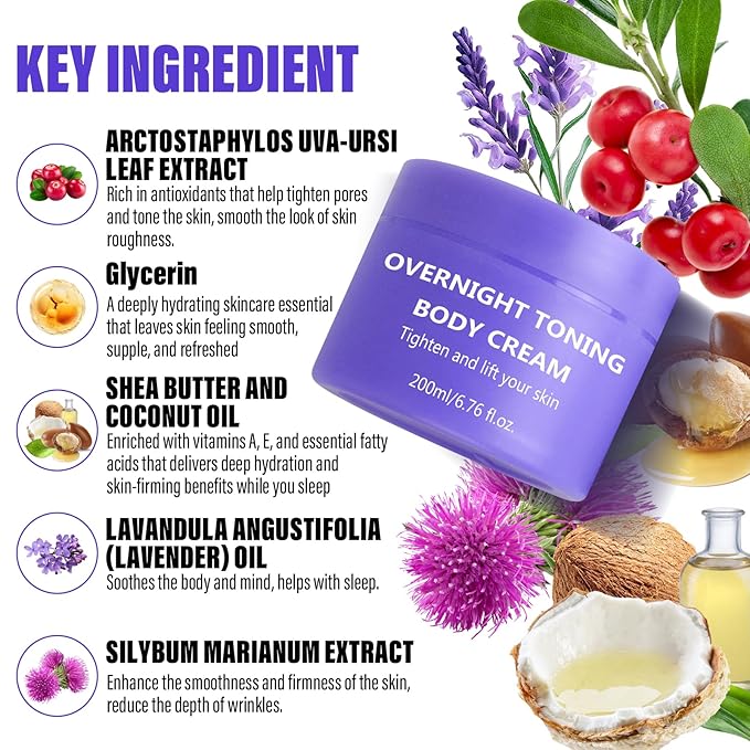 - Overnight Toning Whip: Wake up to smoother, firmer skin with our luxurious overnight toning whip. Designed to work while you sleep, our firming cream helps improve skin tone and texture, it not only enhances the skin's appearance but also moisturizes your skin and improves its elasticity.