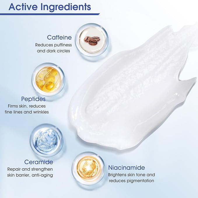 - 【Caffeine Eye Cream】 Caffeine accelerates blood circulation around the eyes, reducing dark circles caused by staying up late, fatigue or poor blood circulation; it also relieves eye bags and puffiness, and is paired with niacinamide to even out skin tone, saying goodbye to dullness and fatigue.