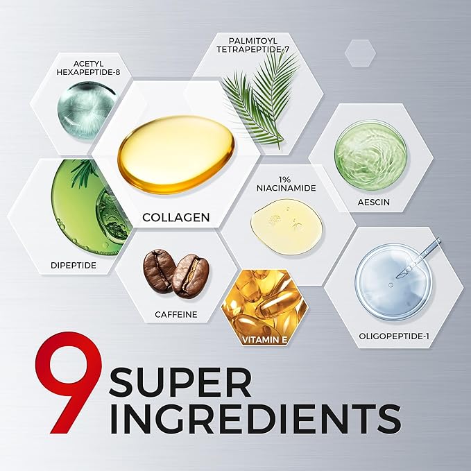 - Improve Moisture Levels and Skin Barrier: Hydrolyzed collagen and niacinamide deliver lasting hydration and support skin elasticity. Caffeine helps reduce puffiness and supports the skin’s natural protective barrier for a refreshed, revitalized appearance
