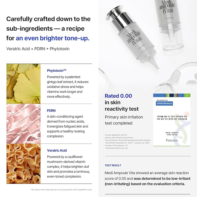 - Special Ingredients : Vitamin C (Ascorbic Acid), Vitamin E (Tocopherol), Vitamin B5 (Panthenol), Phytotoxin™ (Ginkgo Leaf Extract), PDRN, Veratric Acid, Centella Extract Vitamin C (Ascorbic Acid), Vitamin E (Tocopherol), Vitamin B5 (Panthenol), Phytotoxin™ (Ginkgo Leaf Extract), PDRN, Veratric Acid, Centella Extract